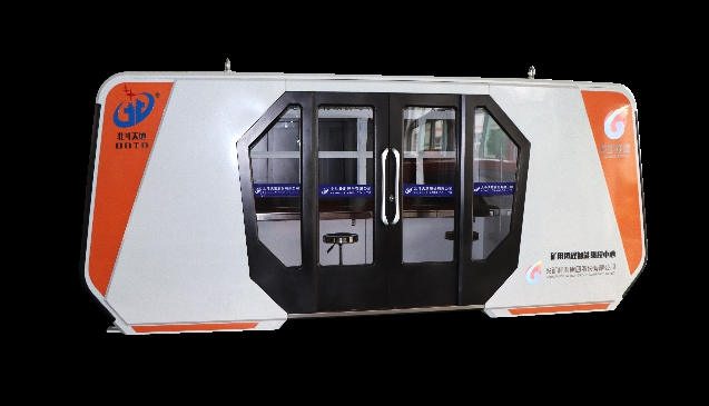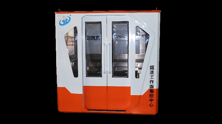 掘进工作面集控中心系统,外壳正面采用双推拉门设计,搭配透明玻璃窗,侧边为推拉窗设计,背部配备可拆卸式检修门,方便设备安装与检修;集控中心内部配有主操控平台、矿用本安型摄像机、照明设备等设备,预留语音扩播安装位;其中主操控平台配有显示单元、各系统操作键盘、操作人员座席等,可展示掘进工作面视频监控系统、掘进机操作系统等实时数据画面,操作人员可通过可视化数据对掘进工作面的设备与环境状态进行实时监控与操控,全方位维护掘进工作面运行过程,确保掘进工作面的安全生产。