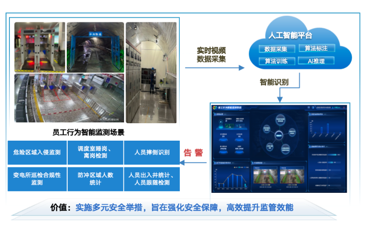 构建员工行为智能监测系统,实时监控员工作业状况,发现异常,立即触发现场语音警示、控制相关设备实施闭锁或停机操作,减少人为因素导致的风险,辅助作业人员有效防范安全风险。
