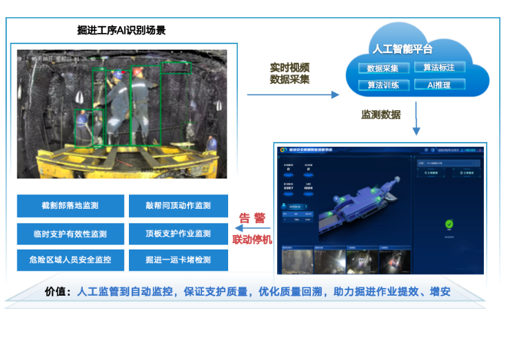 精准识别诸如危险区域人员进入、人员摔倒、截割物掉落、敲帮问顶、钻孔深度监测、锚固剂使用量控制、搅拌时间管理、二次紧固执行、锚索张拉监测等复杂场景,实现了掘进作业从人工监管向自动监控的跨越。