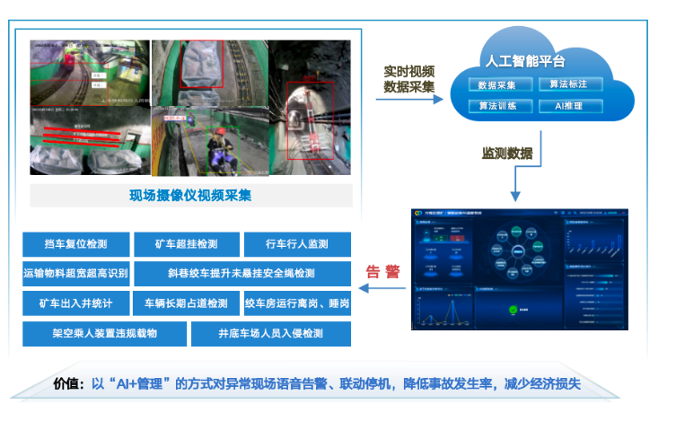实现挡车复位状态检测、行车行人行为监测、矿车出入井统计、绞车房运行状态及离岗/睡岗监测、井底车场人员入侵检测等功能。发现异常情况,系统将立即启动现场语音提醒,采取控制设备闭锁或停机等措施。