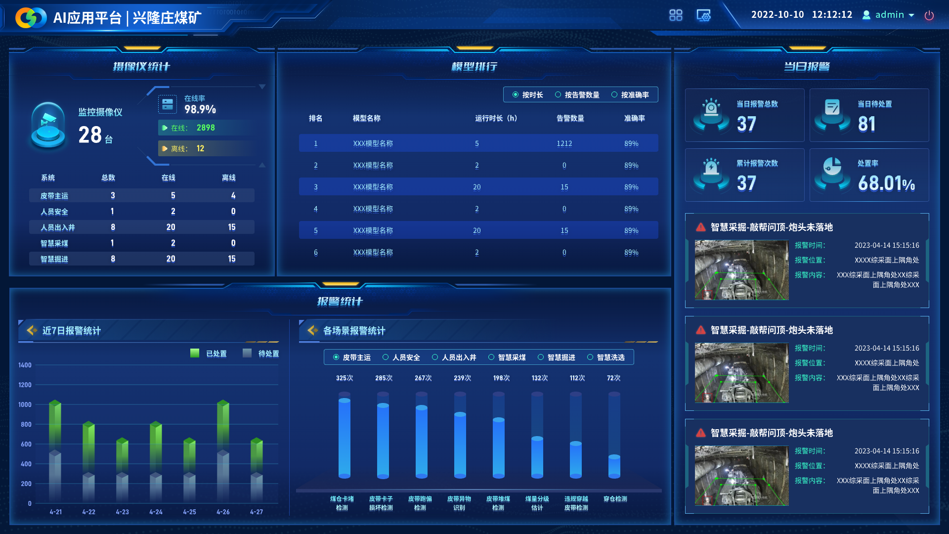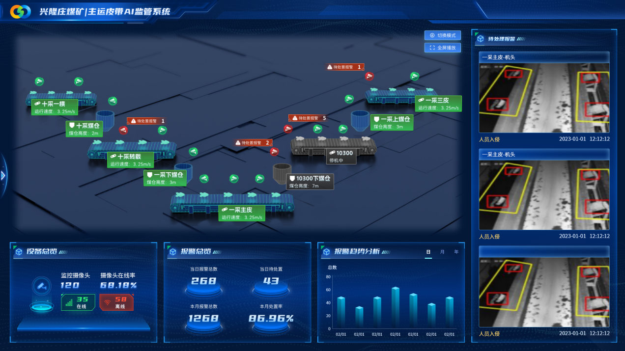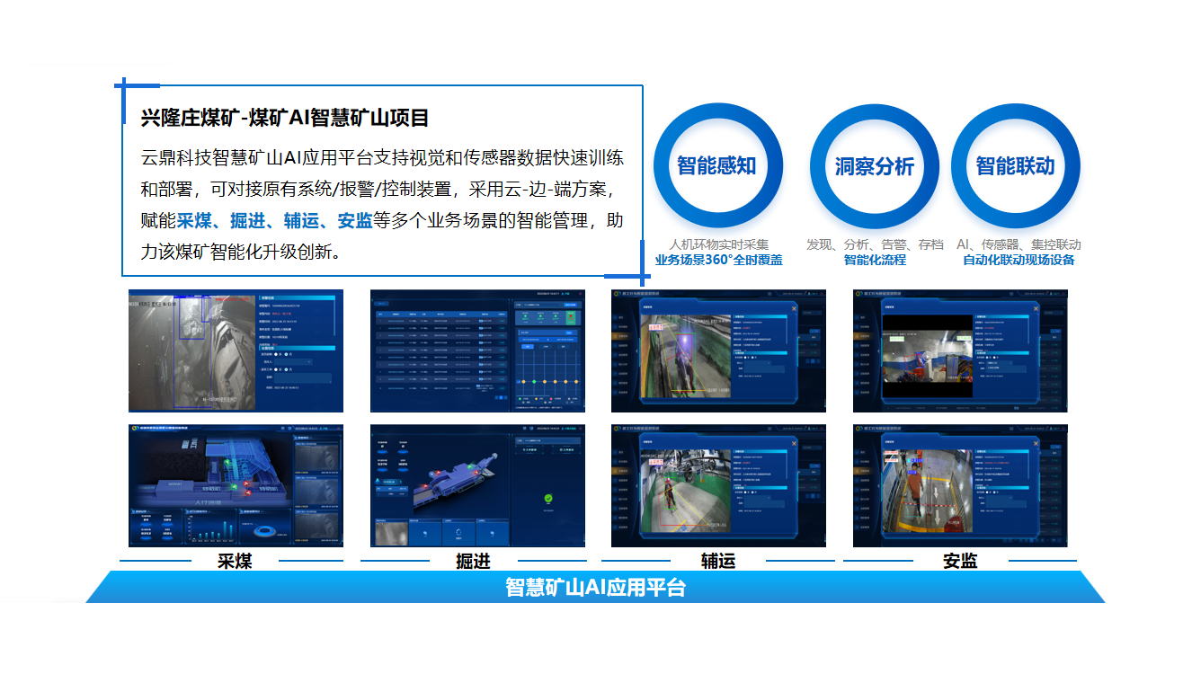 基于盘古矿山大模型,兴隆庄煤矿携手利发国际科技打造了兴隆庄煤矿AI应用平台。平台涉及主皮带AI监管系统、员工行为智能监测系统、掘进安全质量智能监管系统、采煤转载装运异常AI智能控制系统等9个子系统采用云-边-端方案,接入摄像仪460余台,累计部署740多路场景,赋能采煤、掘进、辅运、安监等多个业务场景的智能管理,助力该煤矿智能化升级创新。