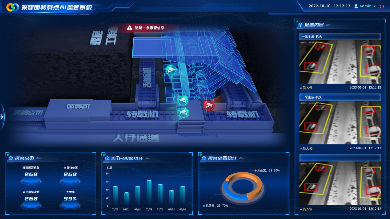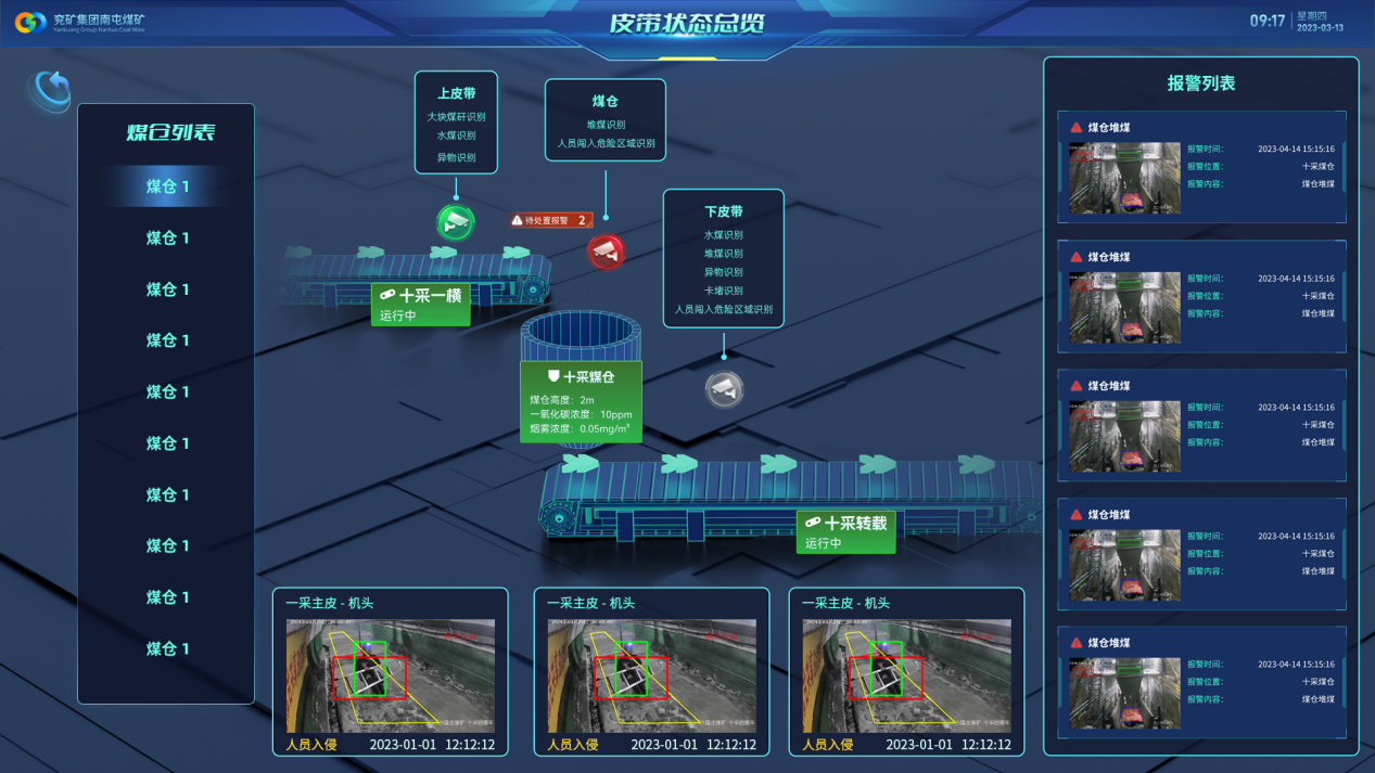 通过实时监测采煤面转载点煤流运行情况,智能识别转载机运行期间的异常问题,根据各转载点的卡堵程度定义不同的处置策略,出现卡堵时分别采取现场告警、停前部、:蟛、前部后部全停等不同的处置方式。