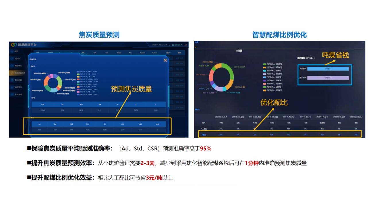 智能配煤系统基于强大的算力,可以输出满足生产质量要求的最优配比,最优策略可以降低配合煤成本,优化煤源,综合降低企业成本,提高企业竞争力。