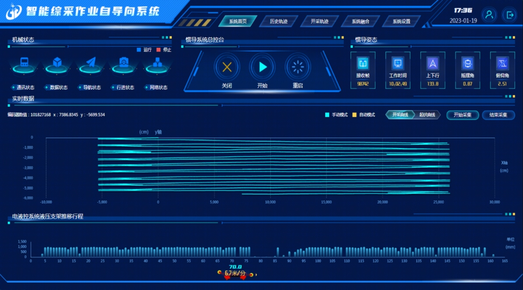 产品针对煤矿采煤工作面,以综采设备自动化控制为基。钊肟剂抗ぷ髅嫔τ眯枨,通过自主研发的IMOSS软件适配矿用高精度惯导定位装置 ,基于北斗矿用5G专网和WIFI无线网络实现煤矿智能综采作业自导向采煤。